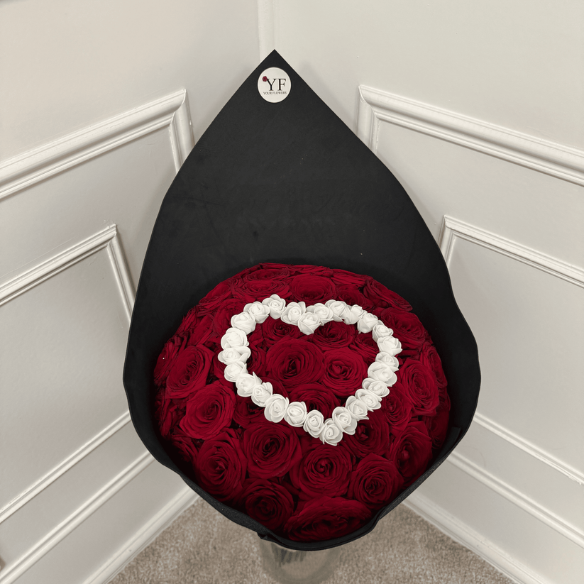 Offrez un message puissant avec ce bouquet de roses rouges fraîches, sublimé par un cœur dessiné en fleurs blanches artificielles directement au centre du bouquet.
